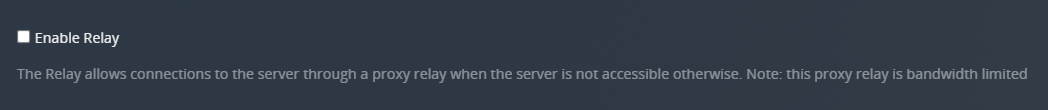 The Relay allows connections to the server through a proxy relay when the server is not accessible otherwise. Relay connections are bandwidth-limited.