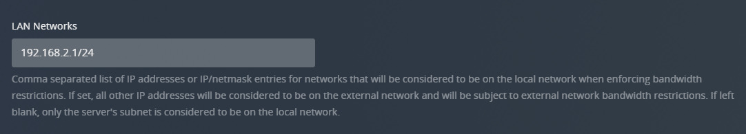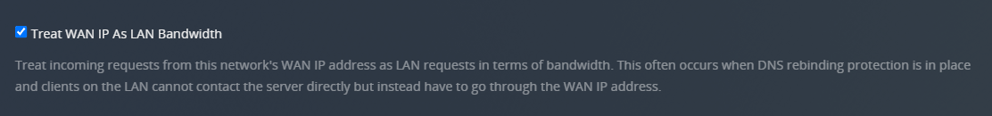 Allows incoming requests from this network’s WAN IP address to be treated as LAN requests in terms of bandwidth. This often occurs when DNS rebinding protection is in place and clients on the LAN cannot contact the server directly but instead have to go through the WAN IP address.